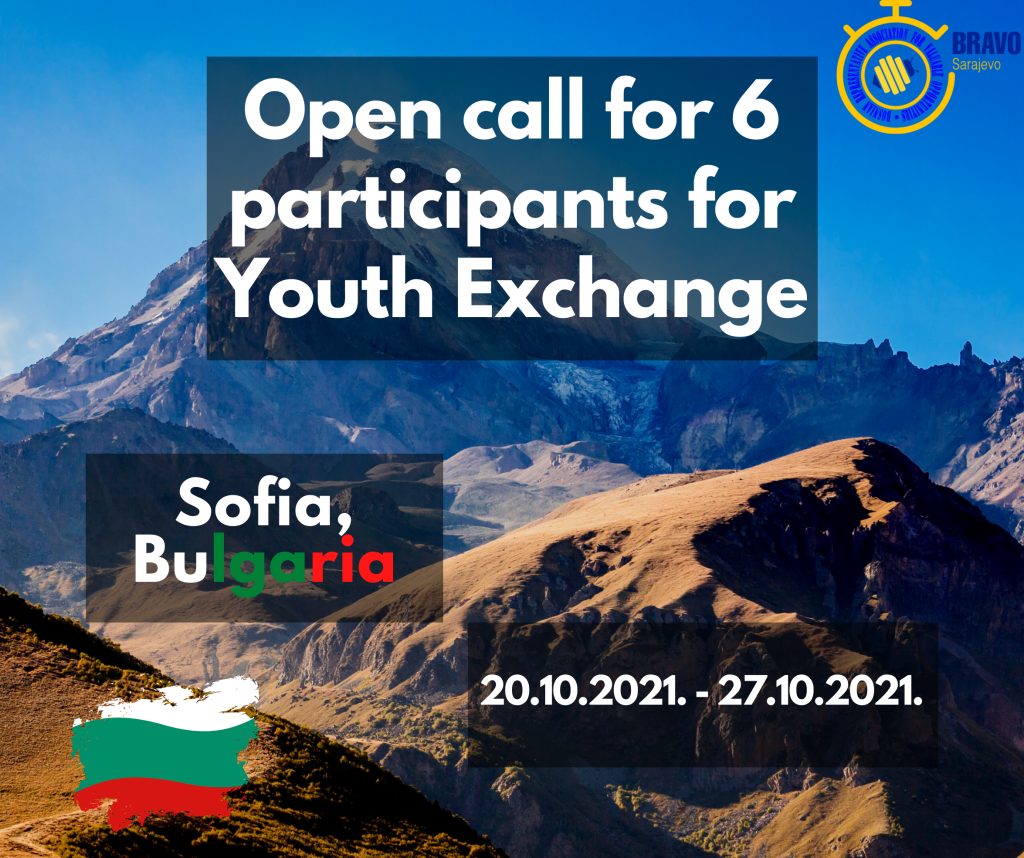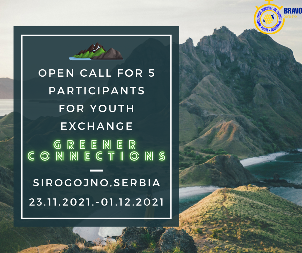 Open Call for 5 Participants for Youth Exchange in – Grenner Connections Name of the project: “Grenner Connections” Date of Project: 23.11.2021 – 01.12.2021. Hosting organization: “SFERA Serbia” Sending organizations: “BRAVO“ Place: Sirogojno, Serbia Participants age: + 18 The number of participants : 4+1 Working language: English Deadline for applying: 05.11.2021 Important note: Preference is given to all persons who have…