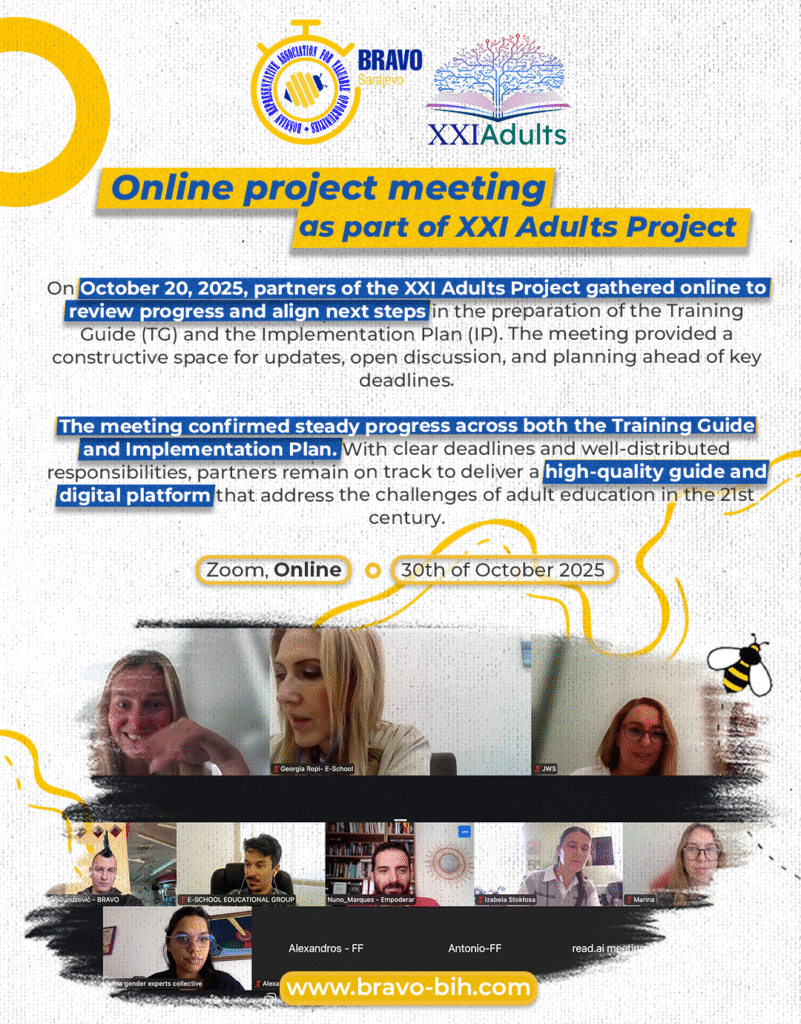 On October 20, 2025, partners of the XXI Adults Project gathered online to review progress and align next steps in the preparation of the Training Guide (TG) and the Implementation Plan (IP). The meeting provided a constructive space for updates, open discussion, and planning ahead of key deadlines.