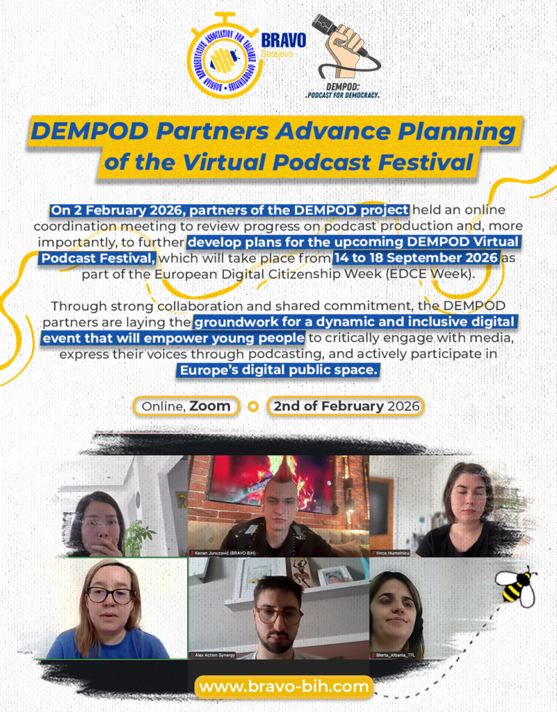 On 2 February 2026, partners of the DEMPOD project held an online coordination meeting to review progress on podcast production and, more importantly, to further develop plans for the upcoming DEMPOD Virtual Podcast Festival, which will take place from 14 to 18 September 2026 as part of the European Digital Citizenship Week (EDCE Week).