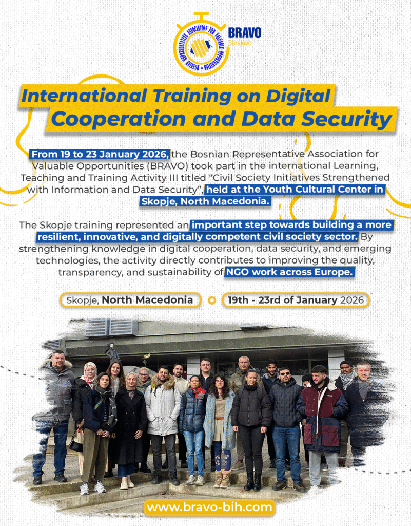From 19 to 23 January 2026, the Bosnian Representative Association for Valuable Opportunities (BRAVO) took part in the international Learning, Teaching and Training Activity III titled “Civil Society Initiatives Strengthened with Information and Data Security”, held at the Youth Cultural Center in Skopje, North Macedonia.
