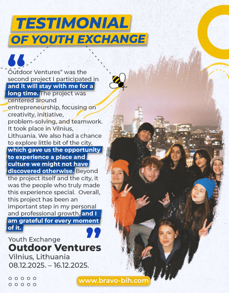 “„Outdoor Ventures“ was the second project I participated in and it will stay with me for a long time. The project was centered around entrepreneurship, focusing on creativity, initiative, problem-solving, and teamwork. It took place in Vilnius, Lithuania. We also had a chance to explore little bit of the city, which gave us the opportunity to experience a place and culture we might not have discovered otherwise. Beyond the project itself and the city, it was the people who truly made this experience special. I built meaningful connections and friendships that I am sure will remain part of my life, not only with people from Bosnia and Herzegovina, but also participants from other countries, including Georgia, Romania, Lithuania and Spain, through whom I got to know different cultures and exchanged ideas and perspectives. This experience helped me grow personally, boosting my confidence, creativity, and ability to work in diverse teams.  It inspired me to keep exploring new opportunities, meet new people, and apply what I learned in my future studies and projects. Overall, this project has been an important step in my personal and professional growth, and I am grateful for every moment of it.”  – Alma Kamaković